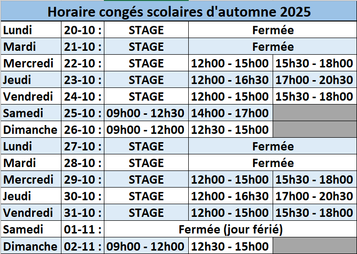 Nous serons heureux de vous accueillir pendant cette période de congés scolaires.